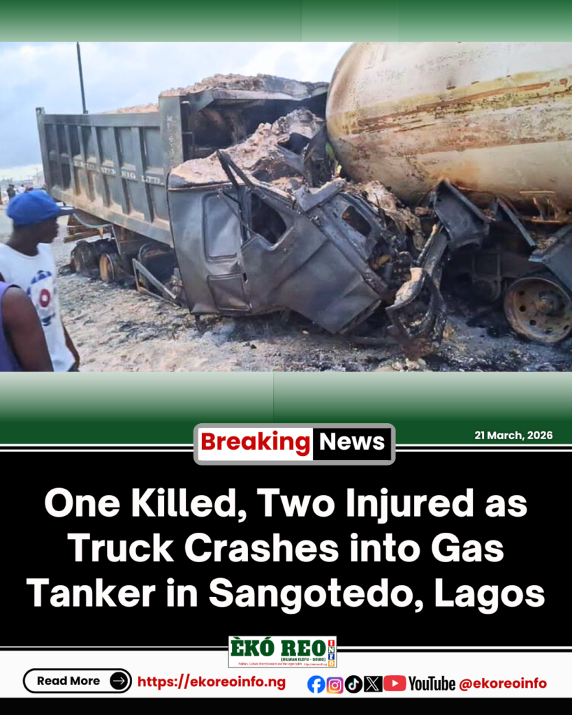 A tragic accident in the Sangotedo area of Lagos has claimed one life and left two others injured after a gas tanker burst into flames near Ologuro Bus Stop, directly opposite a Total filling station.
